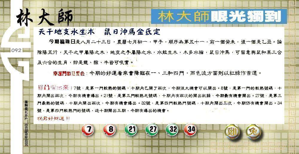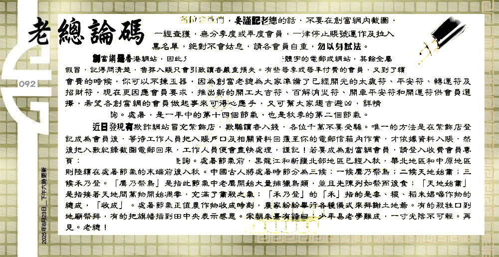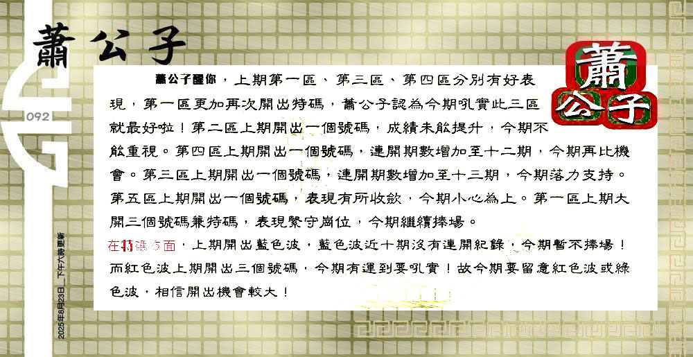 | 主题 :092期:六合皇金句/老总论码/萧公子/林大师/五行夺码/老总信箱截 |