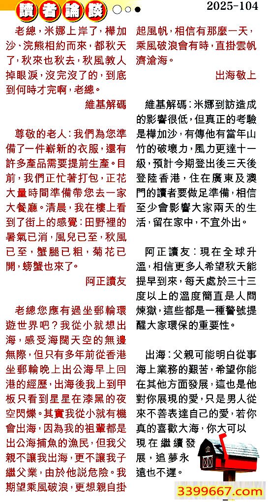 | 主题 :104期:彩民推荐〖貼信讀者論壇〗 |