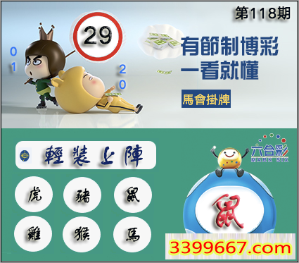 118期正版彩图挂:29 爆:鼠 挂牌成语:轻装上阵 挂牌出肖:虎猪鼠鸡猴马